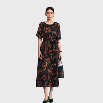 Xiangyunsha Silk Dress | Detachable Belt = 2Styles | Sweat-Free Draped Luxury Guangdong Black PearlGambiered Guangdong Gauze xiangyunsha