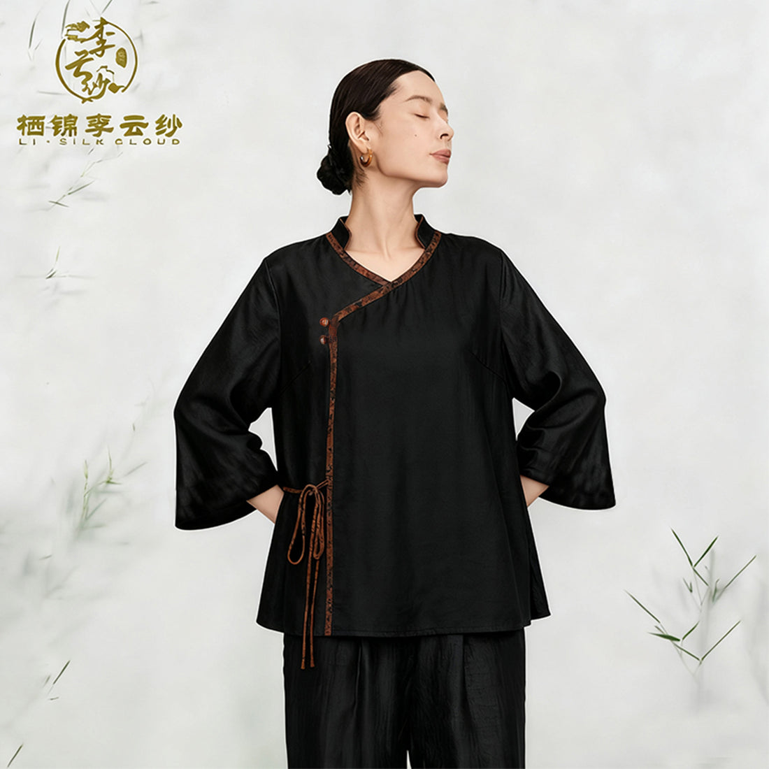 Long Sleeve Top,Classic Knot Buttons Oriental Guangdong Black Pearl Gambiered Guangdong Gauze xiangyunsha