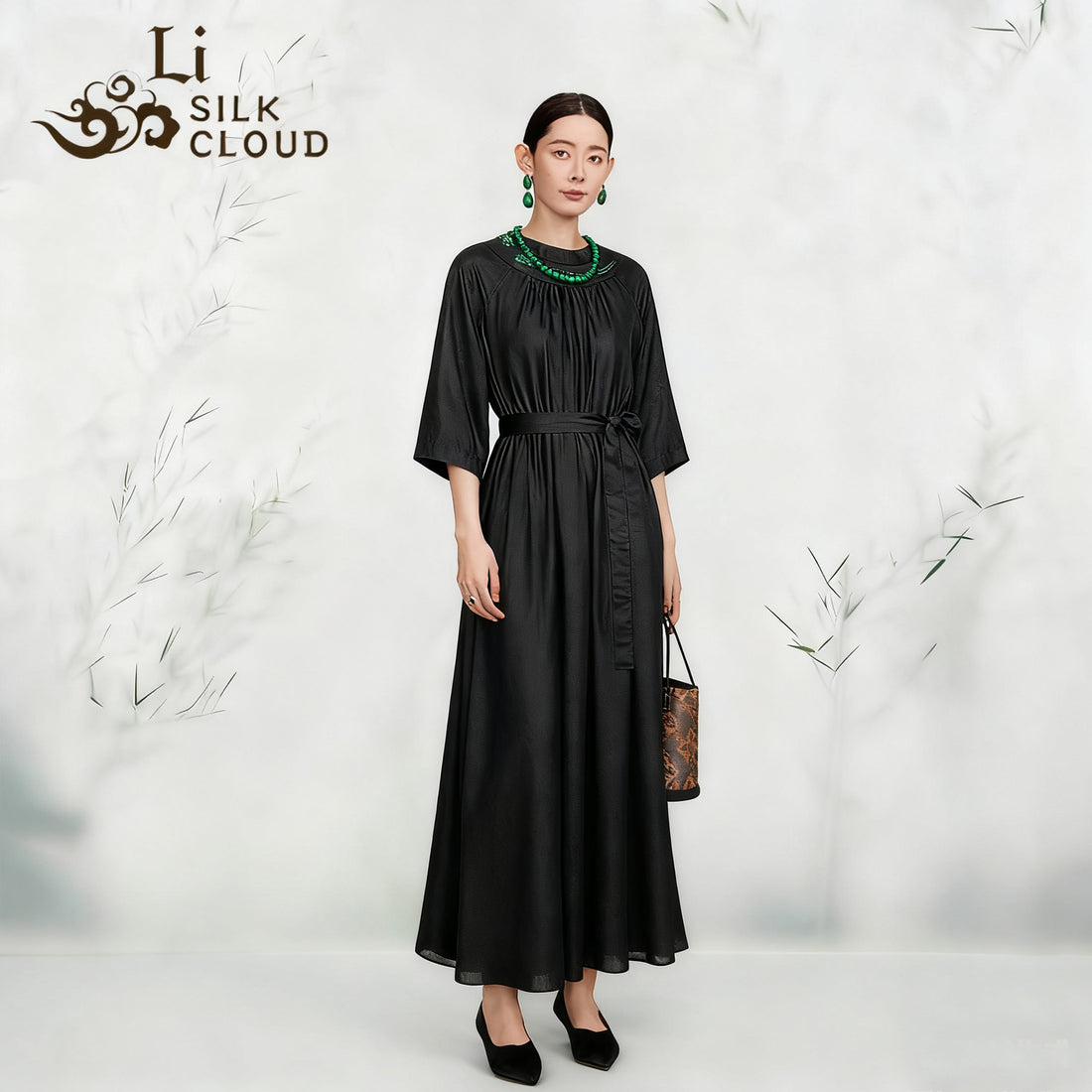 Guangdong Black Pearl Gambiered Guangdong Gauze xiangyunsha Dress, Silk Blend, High-Waisted for Longer Legs, Elegant for Early Autumn Outer Wear & Late Autumn Layering with Coats