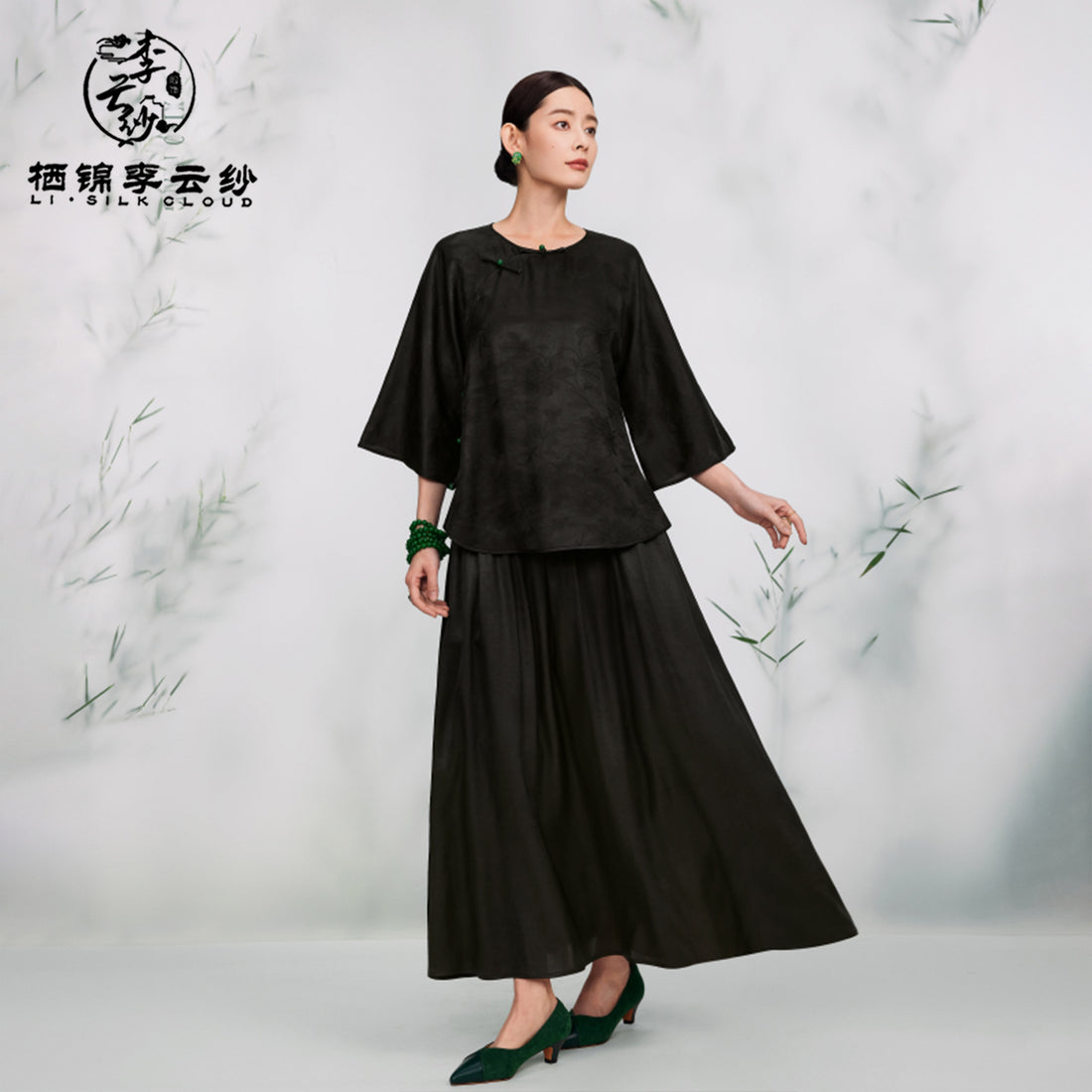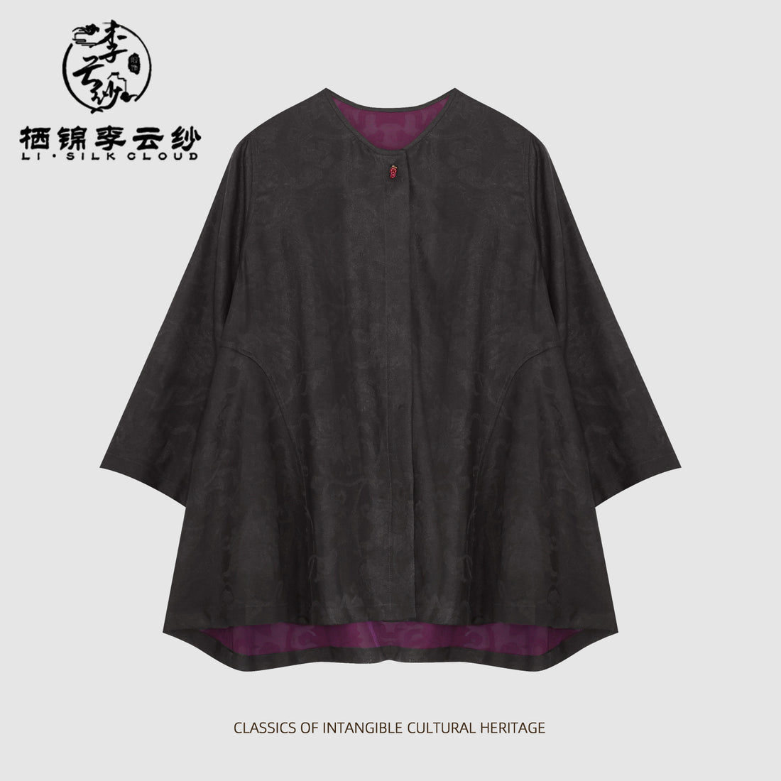 Top,100% Mulberry Silk,Chinese Style Long Sleeve,Elegant Silk Guangdong Black Pearl Gambiered Guangdong Gauze xiangyunsha