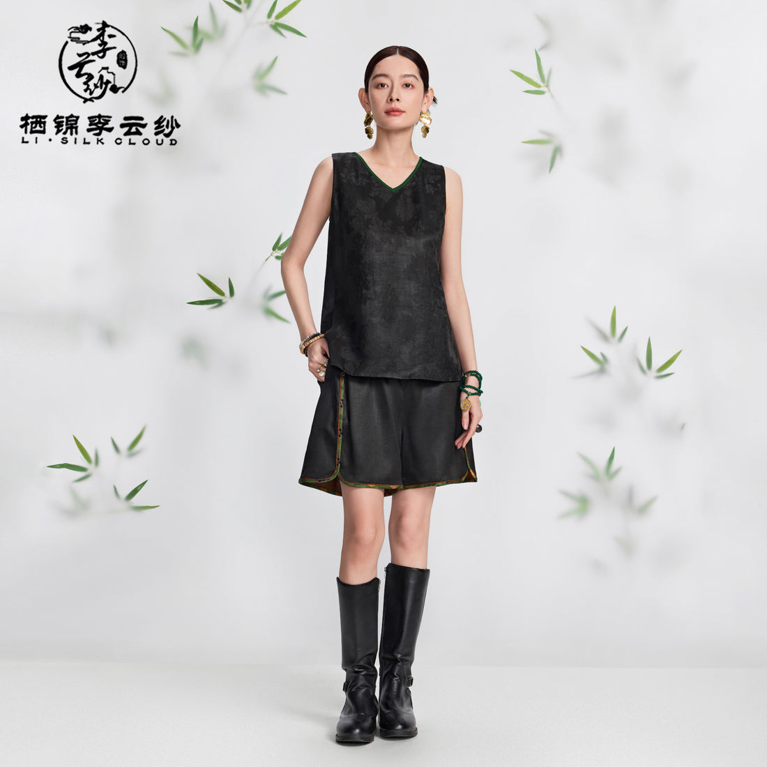 V-Neck Vest Top - 100% Mulberry Silk, Chinese Style, Elegant Sleevel Guangdong Black Pearl Gambiered Guangdong Gauze xiangyunsha