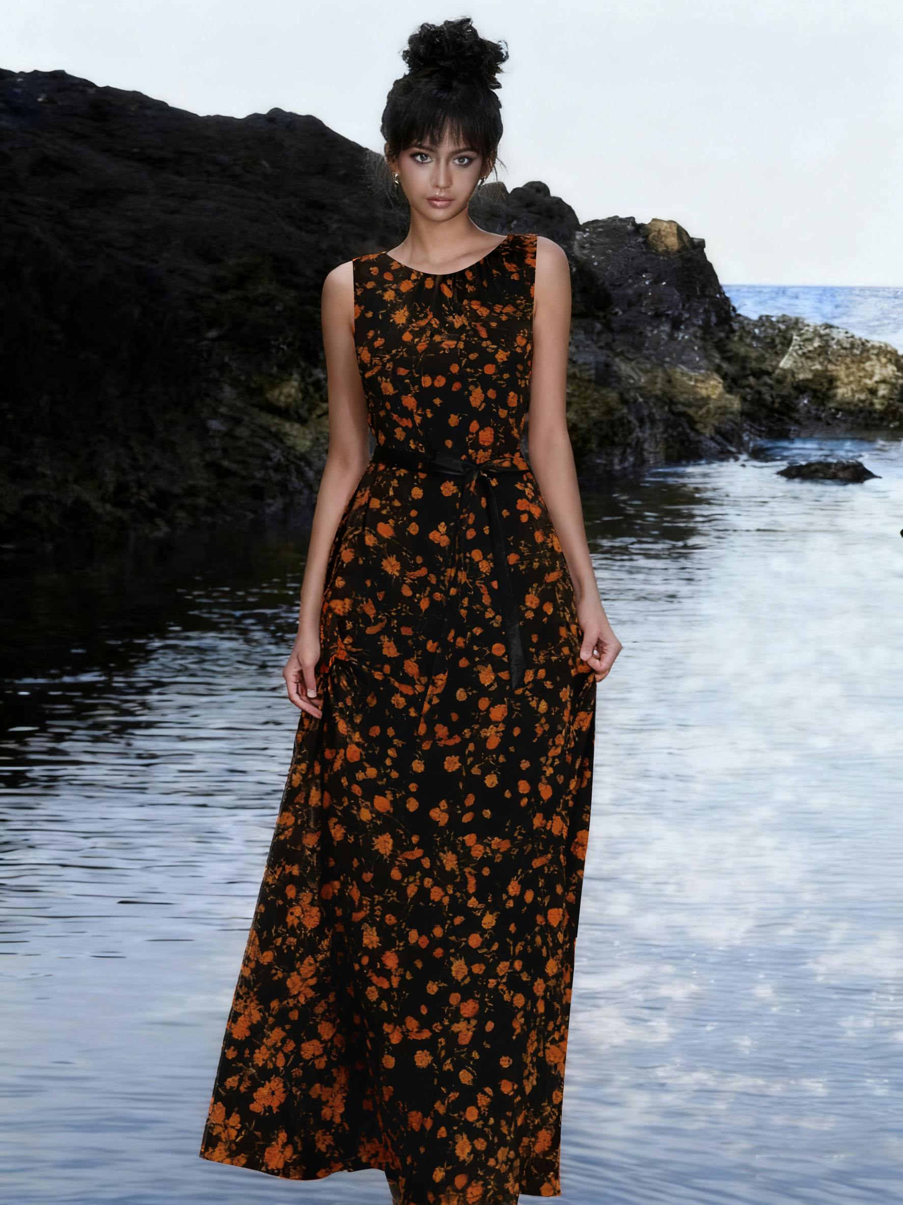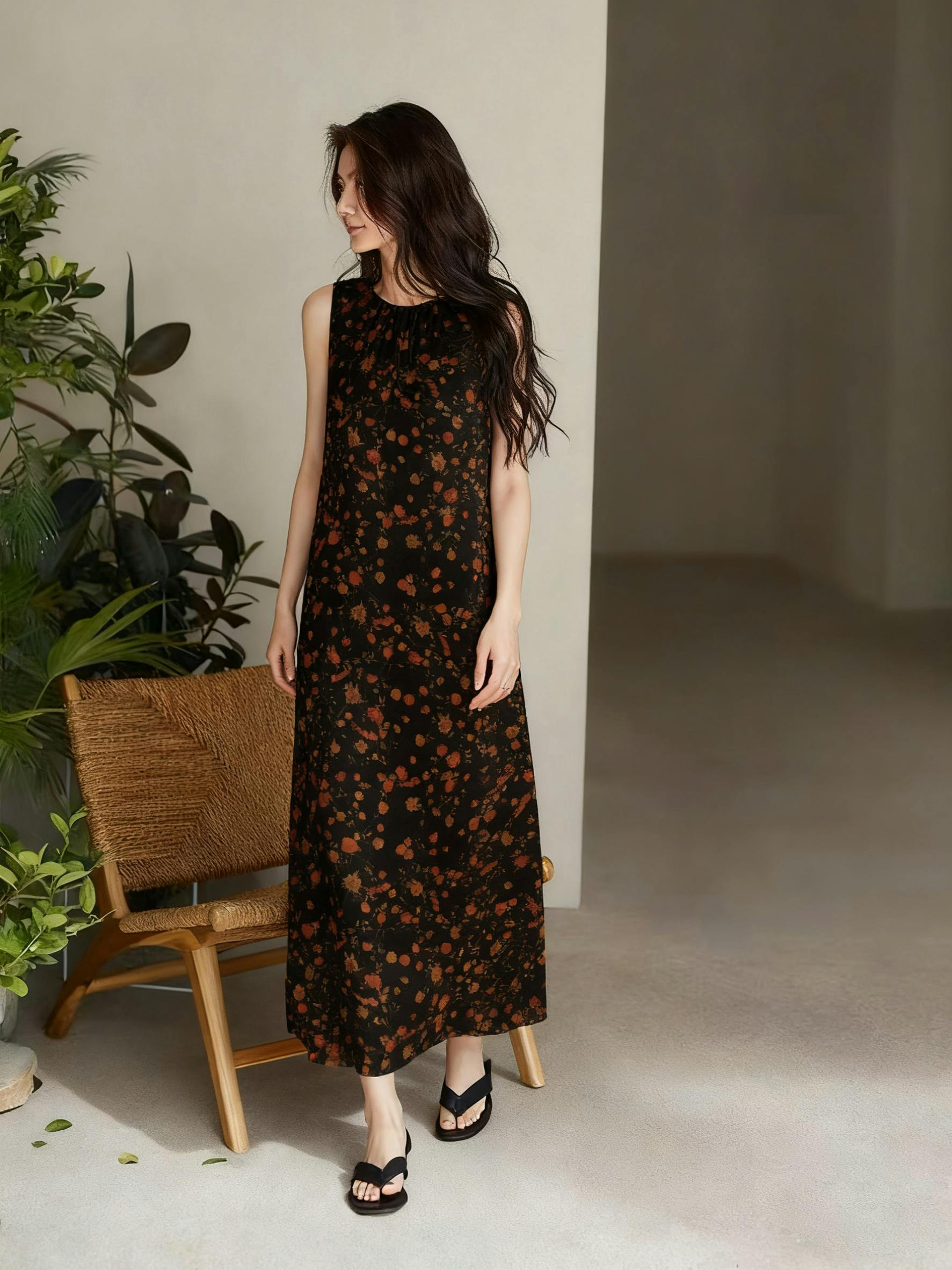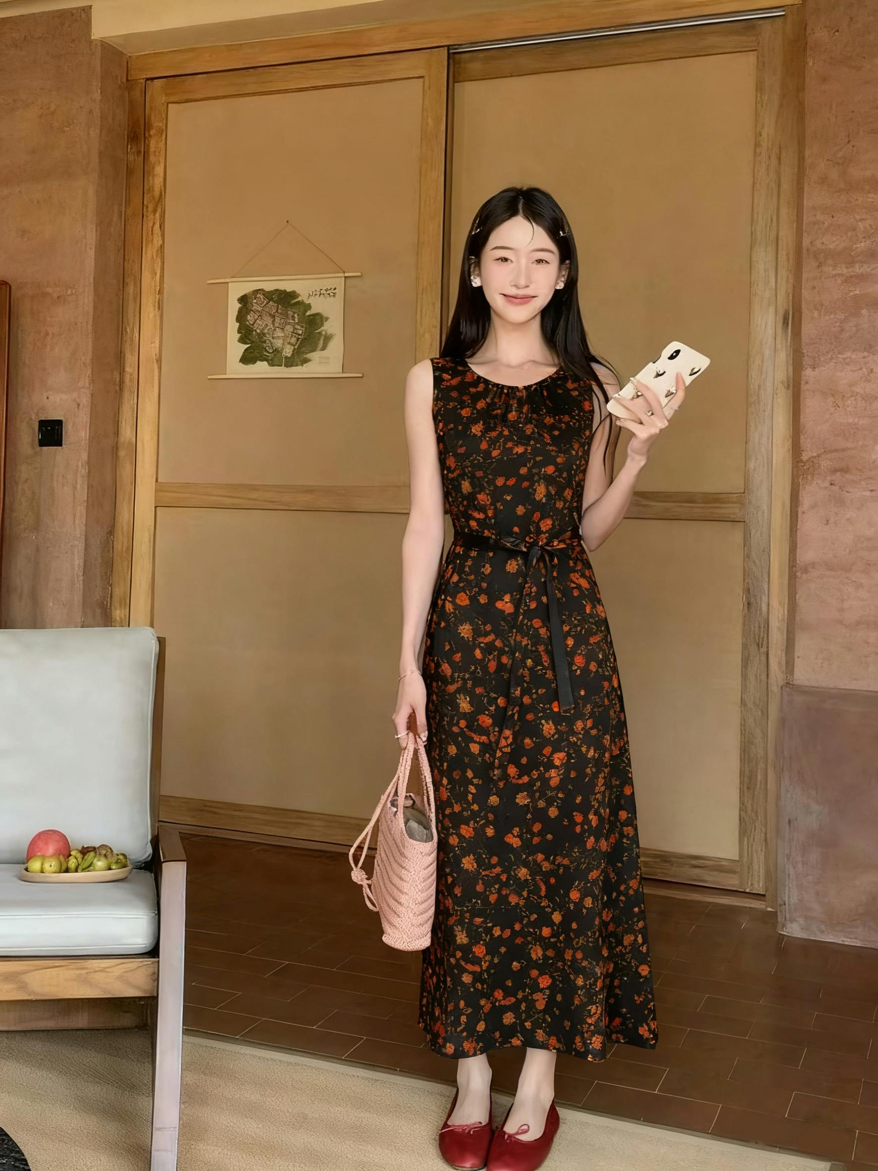 Dress,Skin-Friendly Silk Fabric, Ditsy Floral Patterns, Elegant Guangdong Black Pearl Gambiered Guangdong Gauze xiangyunsha