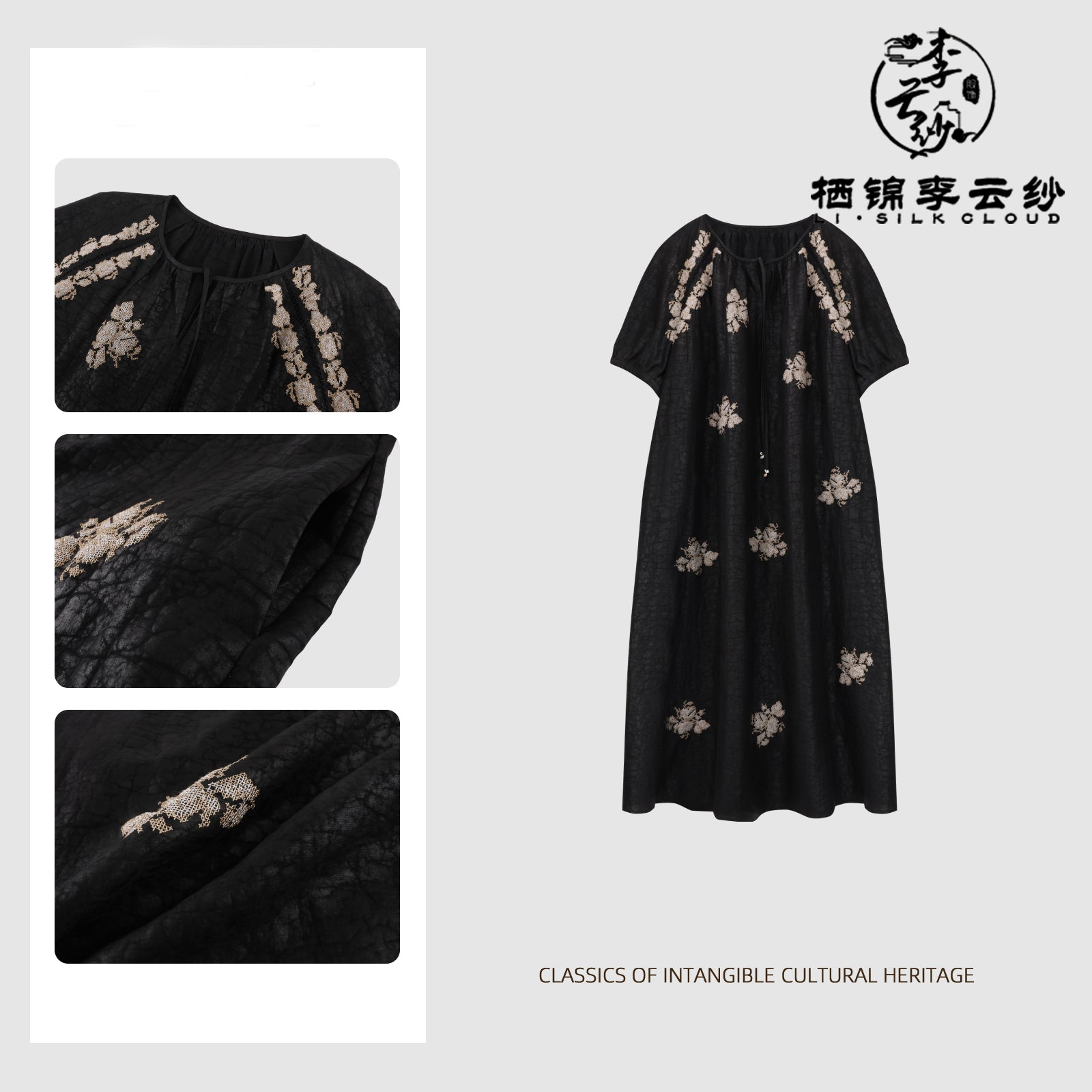 Guangdong Black Pearl Gambiered Guangdong Gauze xiangyunsha Dress, Silk Blend, High-Waisted for Longer Legs, Elegant for Early Autumn Outer Wear & Late Autumn Layering with Coats